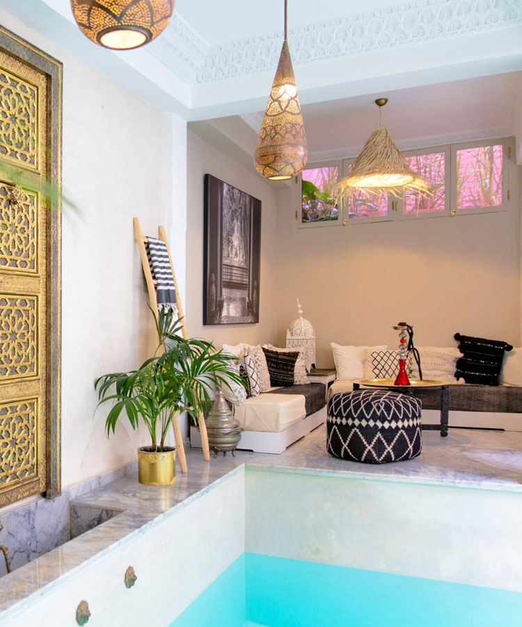 Profitez des nombreux espaces du Riad dédiés à votre bien-être : Solarium, Piscine, Jacuzzi, Salle de massage, Espace lecture, Restaurant, Patios, Terrasse. Chaque espace est une invitation au voyage à travers les différentes ambiances du Riad..